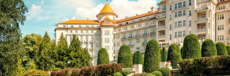 Der imposante Hotelbau, gefühlvoll eingebettet in den Naturrahmen von Karlsbad, erfüllt die anspruchsvollsten Anforderungen an die auf künstlerische Details und vielseitigen Komfort ausgerichtete Kurstadtarchitektur.